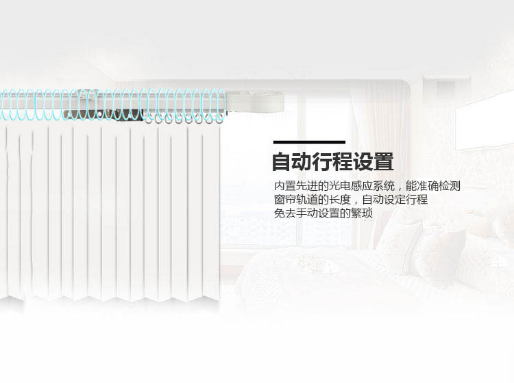 內置先進的光電感應系統,能精準的檢測窗簾軌道的長度,自動設定行程,免去手動設置的繁瑣。