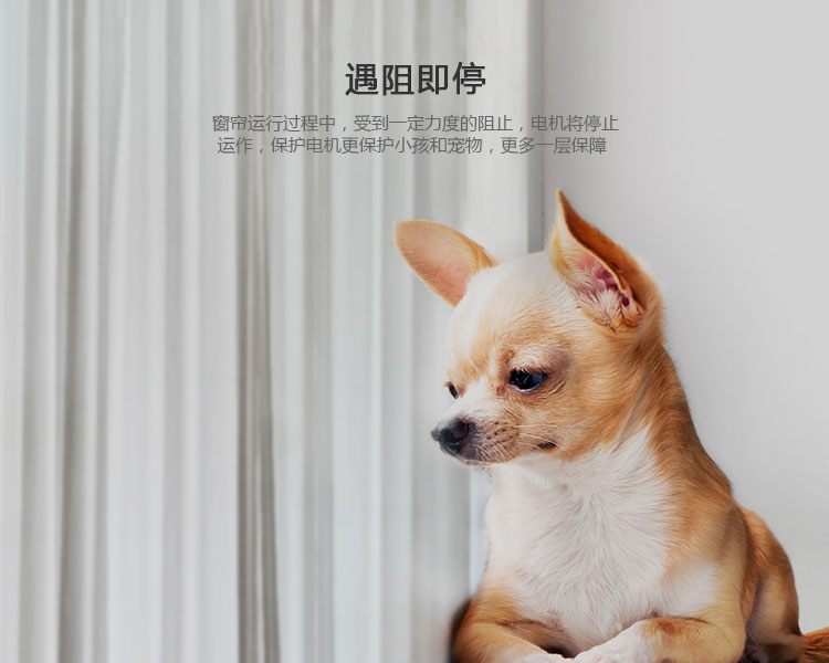 窗簾運行過程中,收到一定力度的阻止,電機將會停止運作,保護電機更保護小孩和寵物,更多一層保障。